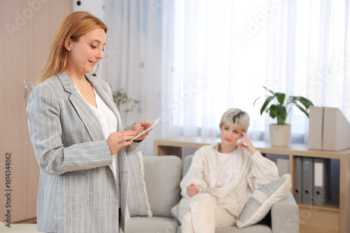 Fototapeta premium Female adolescent psychologist with tablet computer in office