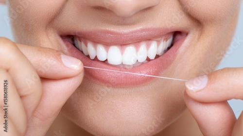 Fototapeta premium Female adult brushing teeth diligently in a bright bathroom with mirror...