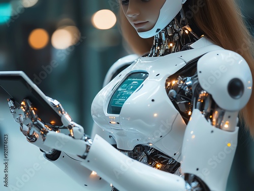 © DudeDesignStudio, Fototapeta premium Female android holding a tablet.