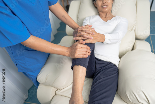 Obraz premium Female asian physiotherapist worker giving leg massage to senior woman,...