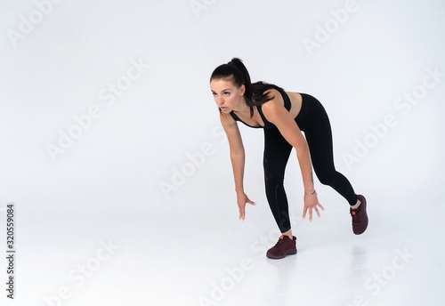 Fototapeta premium Female athlete in position to start running - isolated over a white background.
