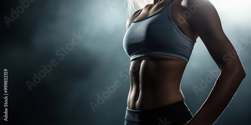 Fototapeta premium Female athletic torso with toned abs and fit body, highlighting health, fitness, and strength in a dramatic low-light setting with a dark background