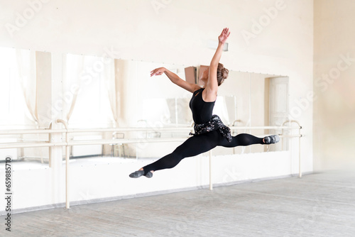 © Mihail, Obraz premium female ballerina dancing in the studio, jumping high and fly