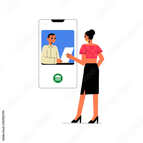 © Creattie, Obraz premium Female Bank Client Interacting With Male Bank Consultant On Mobile Screen In Flat Vector Illustration Symbolizing Online Banking Services And Digital Transactions, Isolated