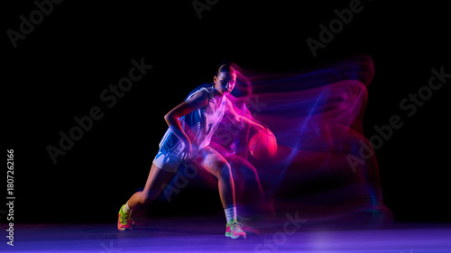Naklejka premium Female basketball player dribbling with ball in glowing studio motion. Concept of fitness promotion, motivation visuals, sports branding, and energetic lifestyle ads.