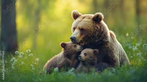 © lestari, Fototapeta premium Female bear and two bear cubs in summer forest among beautiful white flowers