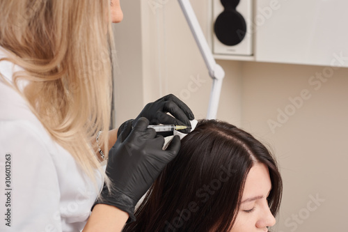 © Alexandra Grua, Fototapeta premium Female beautician makes injection of vitamins and minerals in the scalp. The concept of hair loss.