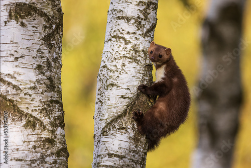 Obraz premium female beech marten (Martes foina), also known as the stone marten climbing the birch tree