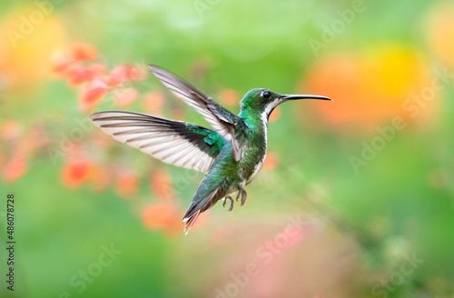 © Chelsea Sampson, Naklejka premium Female Black-throated Mango hummingbird, Anthracothorax nigricollis, in flight facing away from the camera with colorful flowers blurred in the background.