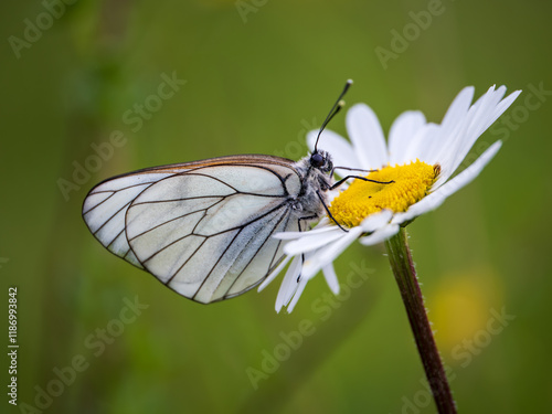 © Stephan Morris , Fototapeta premium Female Black-veined White Butterfly on an Ox-eye Daisy
