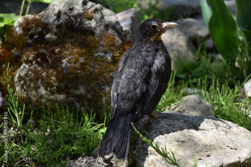 © faraonvideo, Fototapeta premium Female Blackbird - Turdus merula, A bird on the stone, the sun rays between the plants.