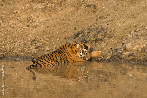 © VISWA, Fototapeta premium Female Bold and Ferocious Tiger drinking water at Kabini, Nagarhole National Park, Karnataka, India