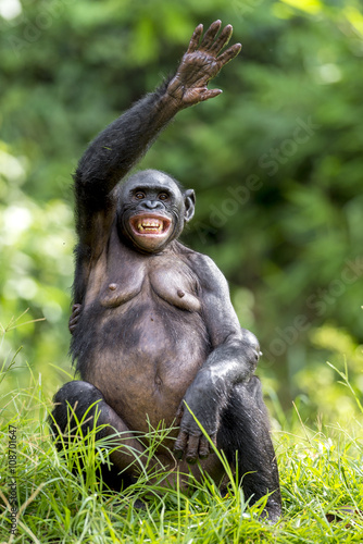 Naklejka premium Female Bonobo with smile sits with the raised hand on a grass.