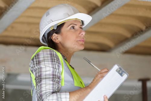 © auremar, Fototapeta premium female builder in safety vest and hardhat writing in clipboard
