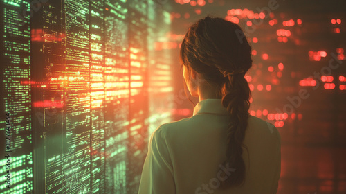 © Your Hand Please, Fototapeta premium female businesswoman stands confidently with her back to the camera, immersed in a virtual cyber tech environment. The glowing screens and futuristic elements symbolize innovation and empowerment