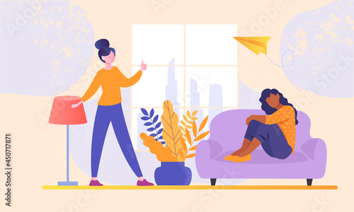 © Rudzhan, Obraz premium Female character is on mental healthcare about feelings, stress and depression. Concept of psychology therapy doctor session with confused patient. Flat cartoon vector ilustration