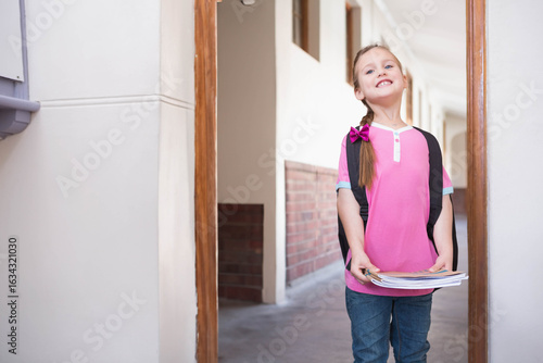 Obraz premium Female child standing in wooden door frame in school corridor holding notebooks and backpack