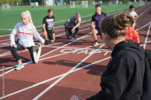 Fototapeta premium Female coach and group of children conducts a training session at the stadium. School gym trainings or athletics