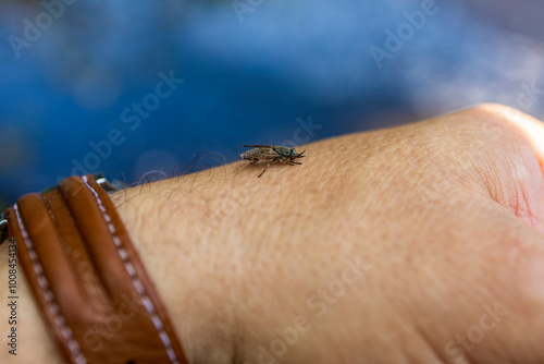 © Tosh Lubek, Obraz premium Female Common horse fly or Cleg fly (Haematopota pluvialis) biting and sucking blood from a human hand skin close-up