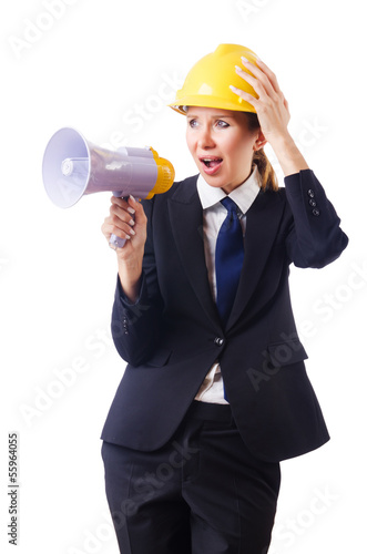 Fototapeta premium Female construction worker with loudspeaker