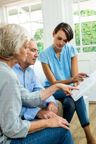 Fototapeta premium Female consultant reading report with senior couple