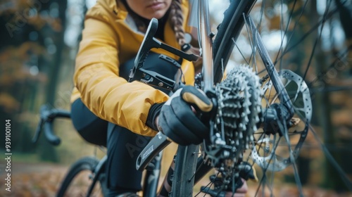 Fototapeta premium Female cyclist focused on fixing the chain of her bike, using tools to...