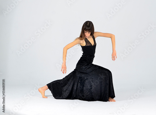 © pedro, Fototapeta premium Female dancer isolated dancing with black dress on grey background