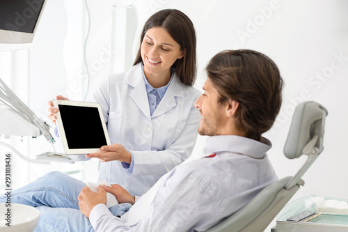 © Prostock-studio, Obraz premium Female dentist doctor showing patient blank digital tablet screen