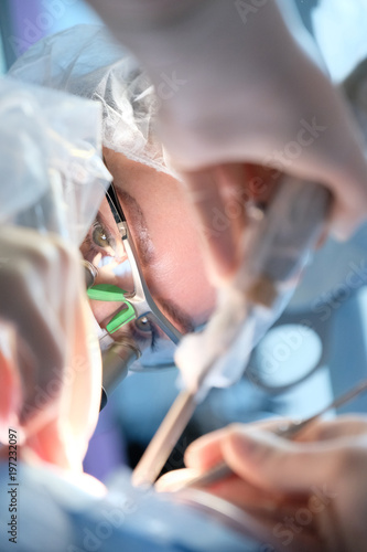 Fototapeta premium Female dentist in surgical uniform at the clinic while performing surgery for...