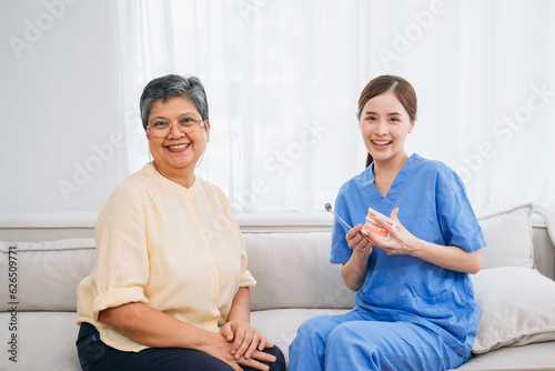 © NewSaetiew, Fototapeta premium Female Dentist Providing Dental Treatment for Senior Woman at Home. Healthcare and Home Care Concept. Female professional doctor.