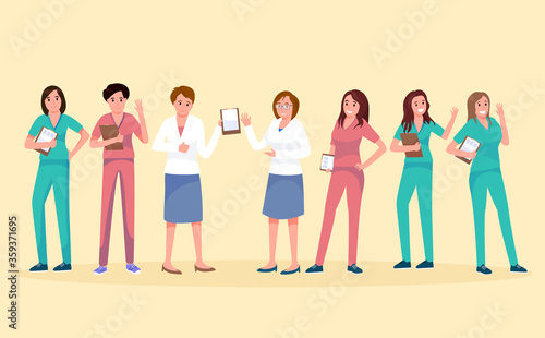 Obraz premium female doctor and nurse staff. vector flat illustration design. flat style