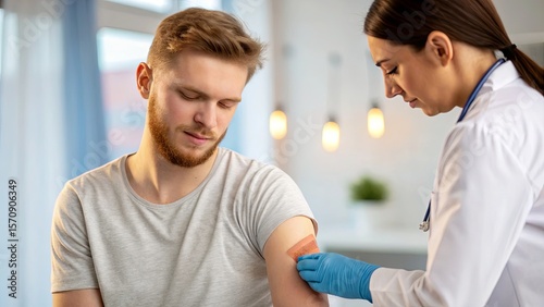 Obraz premium Female doctor applying an adhesive bandage to a young man's upper arm after a...