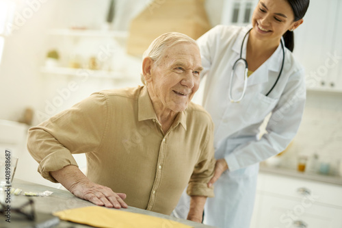 Obraz premium Female doctor assisting elderly man with getting on feet