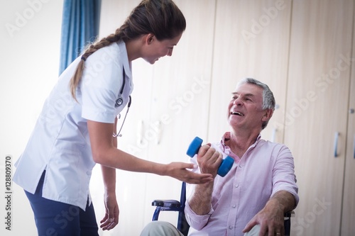 Obraz premium Female doctor assisting senior man in lifting dumbbell
