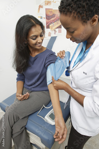 © MDBPIXS, Fototapeta premium Female doctor checking happy Indian patient's blood pressure at the clinic
