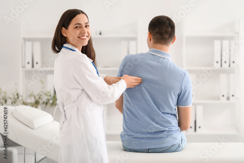 Fototapeta premium Female doctor checking posture of young man in clinic