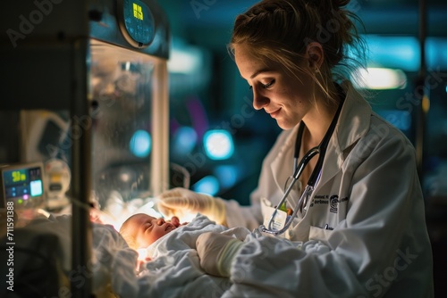 © chutikan, Obraz premium Female doctor examining newborn baby in incubator