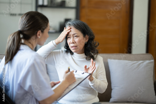 © PaeGAG, Obraz premium Female doctor explaining diagnosis to her old patient.