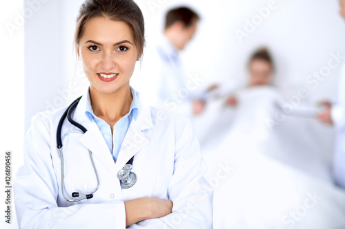 Fototapeta premium Female doctor smiling on the background with patient in the bed