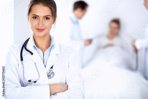 © rogerphoto, Fototapeta premium Female doctor smiling on the background with patient in the bed