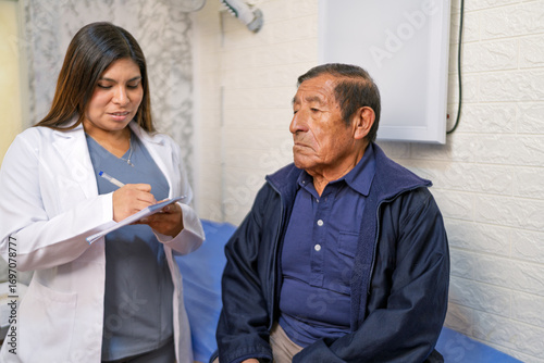 © Guillermo Spelucin, Obraz premium Female doctor taking notes while examining senior patient in clinic