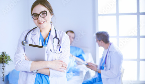 © lenets_tan, Fototapeta premium Female doctor using tablet computer in hospital lobby