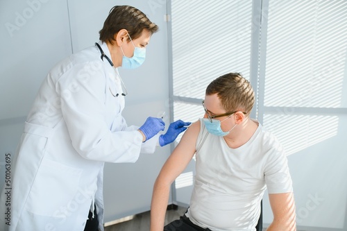 © Serhii, Fototapeta premium Female doctor vaccinating a man