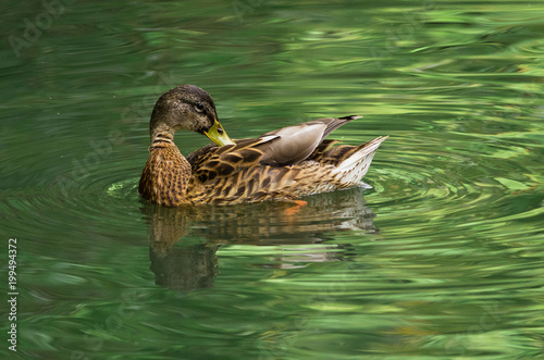 © emmapeel34, Fototapeta premium female duck in the green water is washing the feathers.