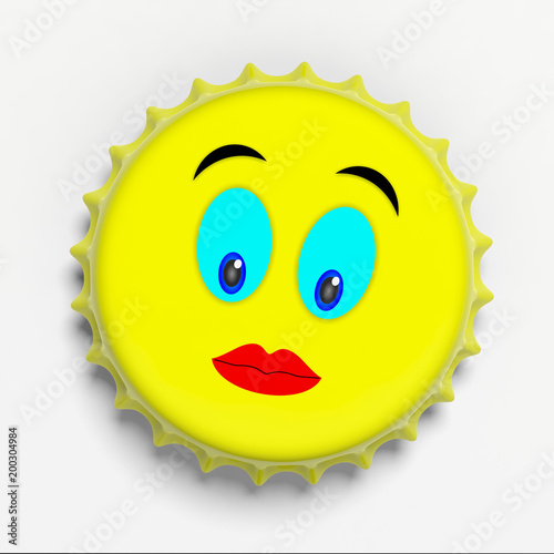 © Rawf8, Fototapeta premium Female emoticon on a yellow beer cap isolated on white background, top view. 3d illustration