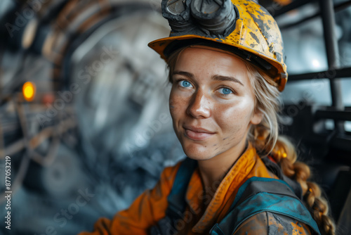 © Ungrim, Fototapeta premium Female engineer in yellow protective gear standing at a mining site. Industrial portrait photography. Mining industry and engineering concept