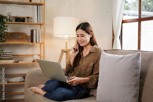 © Katcha, Fototapeta premium Female entrepreneur touching play her hair while sitting on big