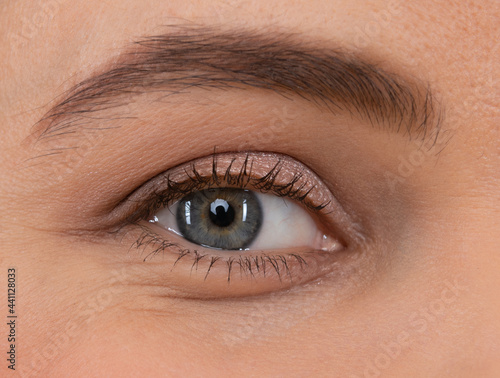 © Olena, Obraz premium Female eye. Eye makeup. Arched eyebrow and natural eye-shadow. Eyesight. Eyelash extension.