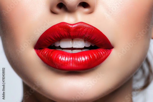 Obraz premium Female face with beautiful red female lips and cured white teeth, cosmetology...