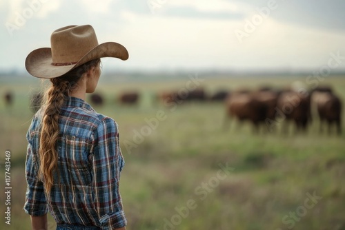 © The 2R Artificiality, Obraz premium Female farmer in plaid shirt and cowboy hat gazing at cattle on a green ranch under a cloudy sky with ample empty space for text.